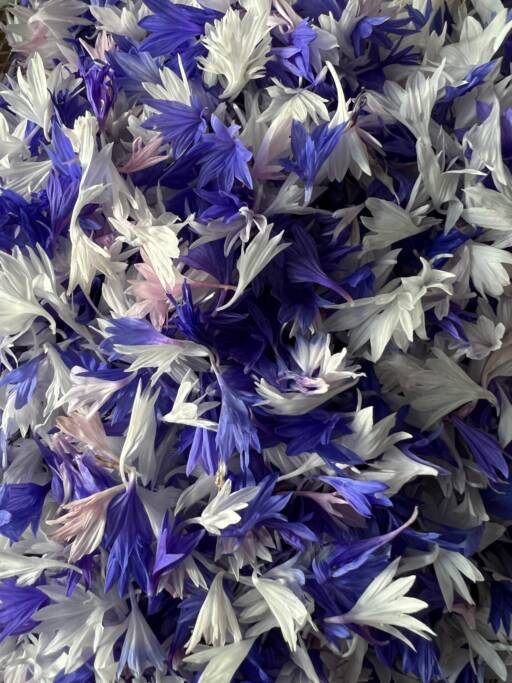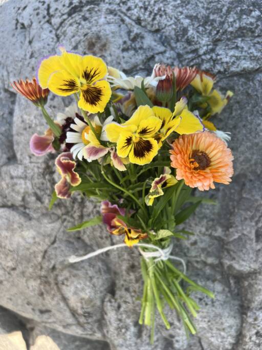 Liten bunt enkle blomster, av én sort – kr. 50,- per bunt (blomster som kornblomst, tagetes, ringblomst, stemor)